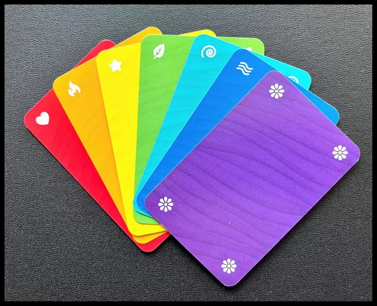 4. De neergelegde is de zesde kaart in een andere kleur. De regenboog is gevormd en de actieve speler krijgt de zes kaarten uit de rij (zes punten dus).