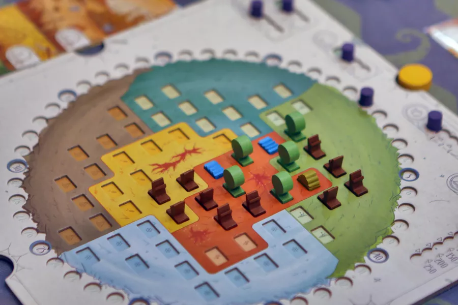 Het doel is duidelijk en ook de manier om dit te bereiken hoeft geen extra uitleg. De zon belicht het geheel vanaf 4 verschillende kanten in een voorspelbare volgorde. Dat levert een leuke puzzel op waarbij alles valt of staat met de bioomkaarten. 42 stuks waarvan er 7 het symbool uitdroging dragen. Dit ook altijd in combinatie met de eigenschap ‘ontkiemen’.