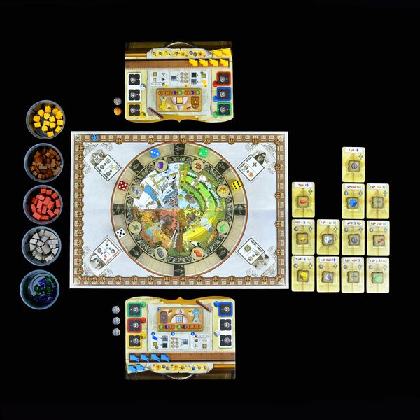 De acht grondstoffentegels worden geschud en willekeurig op de daartoe voorzien plaats op de markt gelegd. De invloedskaarten worden geschud en eveneens op de markt gelegd. Een willekeurige speler neemt de vijf dobbelstenen en rolt die. Een voor een worden de dobbelstenen in de markt gelegd, te beginnen bij de grondstoftegel met het kruis. Alle grondstoffen worden als algemene voorraad naast de markt gelegd. Er zijn zes verschillende grondstoffen: hout, baksteen, steen, goud, groene edelstenen en paarse edelstenen.