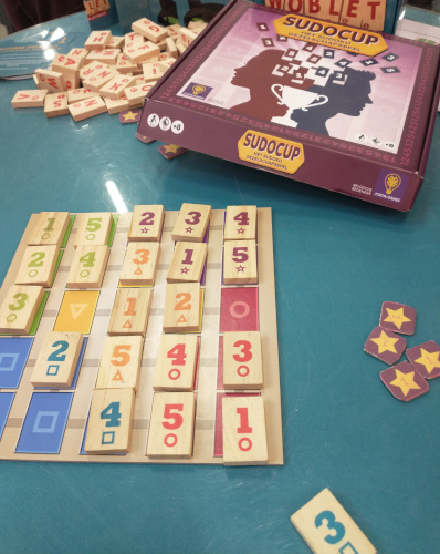 Jorta Games was, na enkele jaren wat minder aanwezigheid, aanwezig om enkele prototypes voor te stellen. We speelden Sudocup. Het is een venijnig spelletje waarbij twee spelers om beurten tegels leggen met een cijfer in één van de vijf kleuren. Telkens wanneer je een rij, kolom of zone compleet maakt met de cijfers 1 tot 5 scoor je een punt. Als je cijfer van de andere speler blokkeert, moet je dat melden. Het levert een extra punt op.