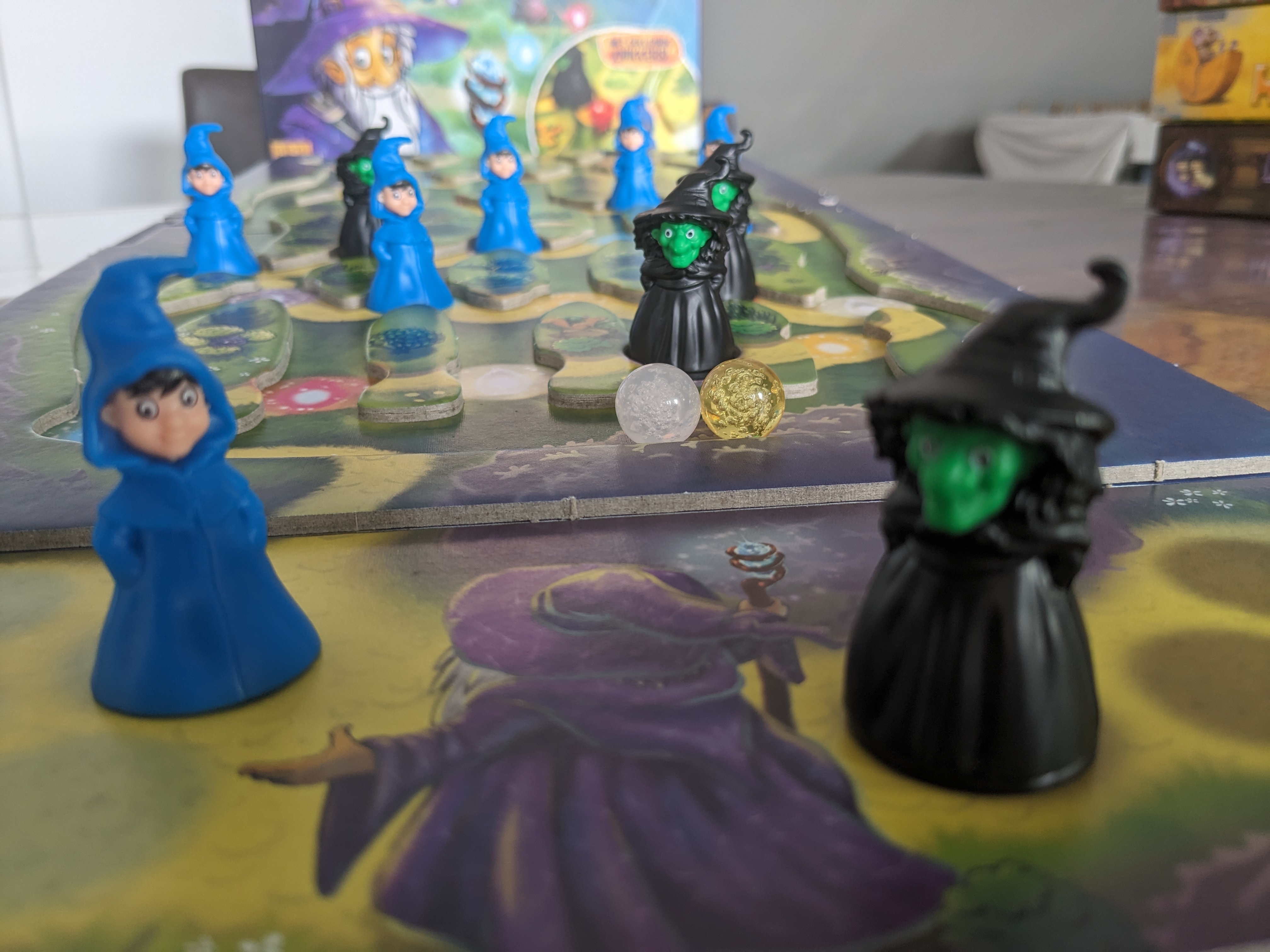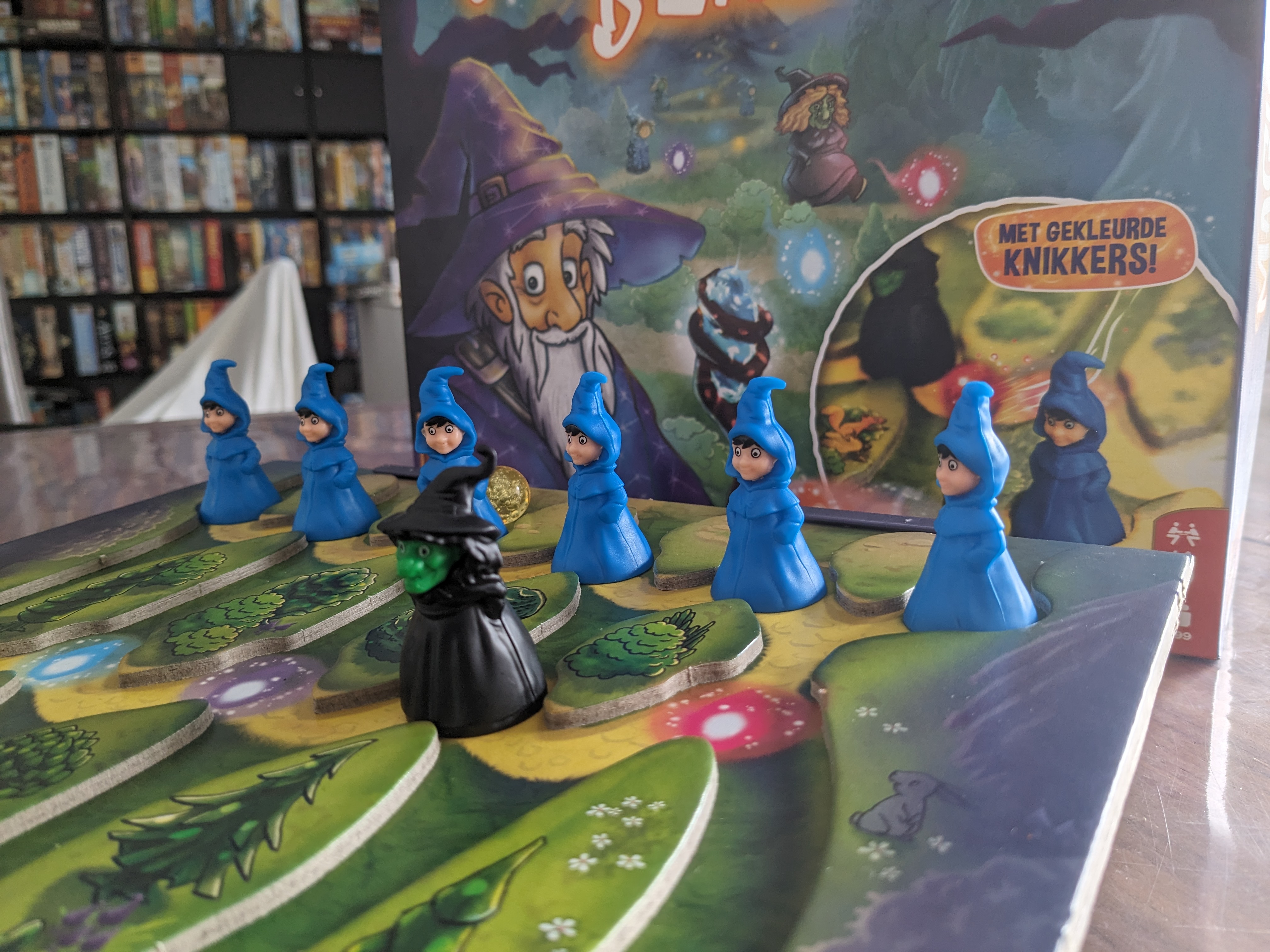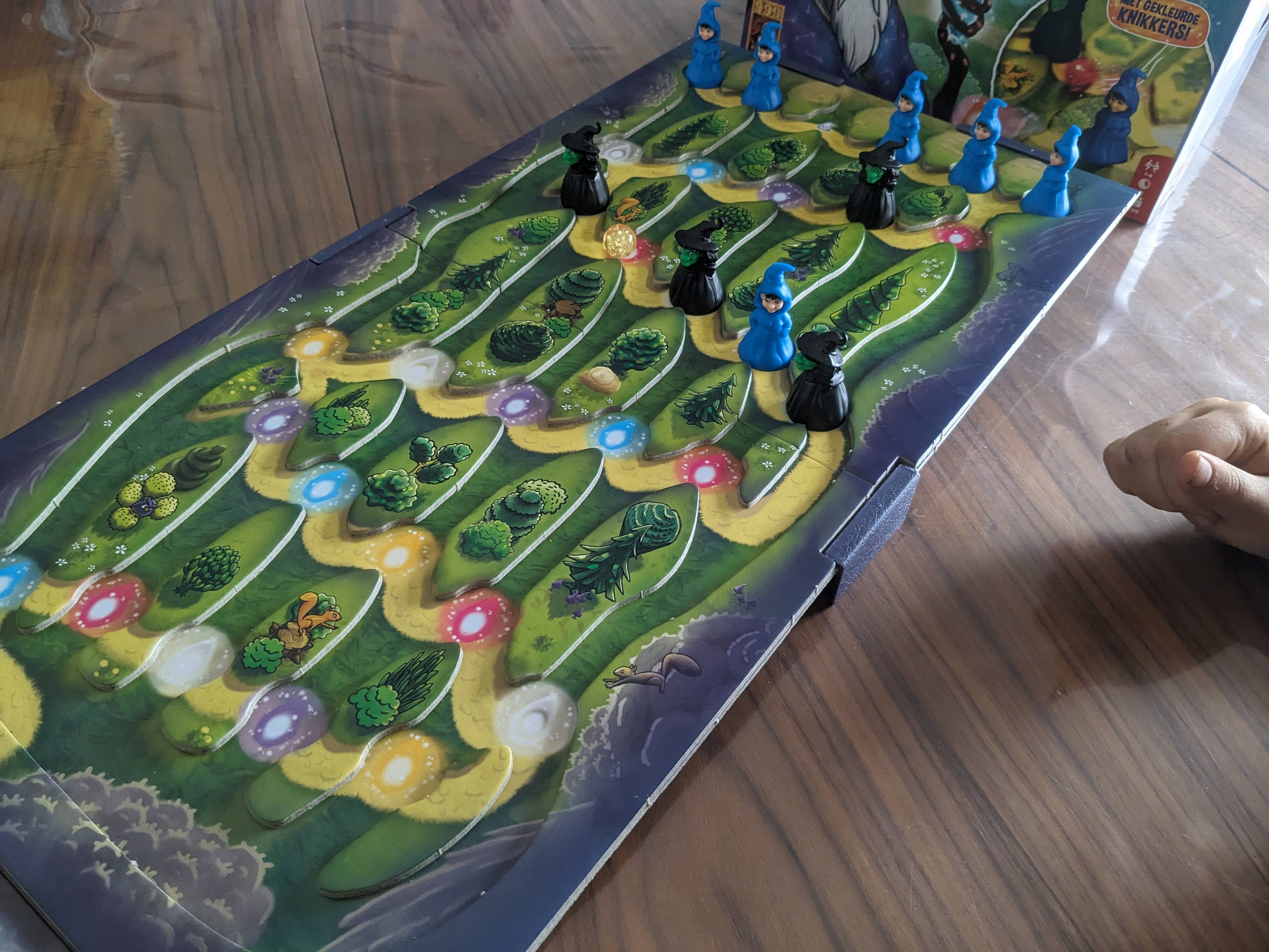 In het coöperatieve spel winnen de spelers als ze 4 feetjes aan de voet van de berg krijgen voor er 3 heksen beneden aankomen.