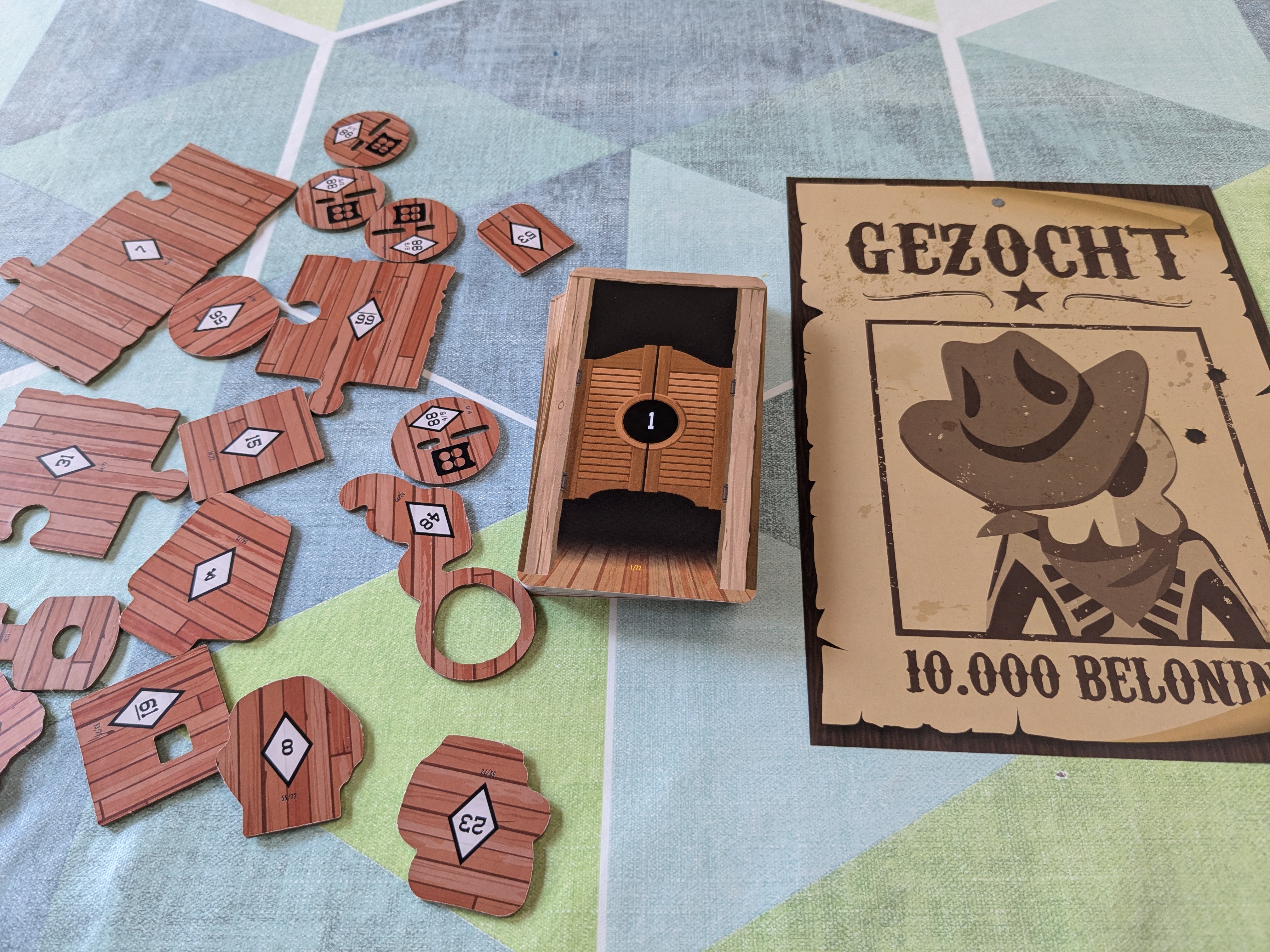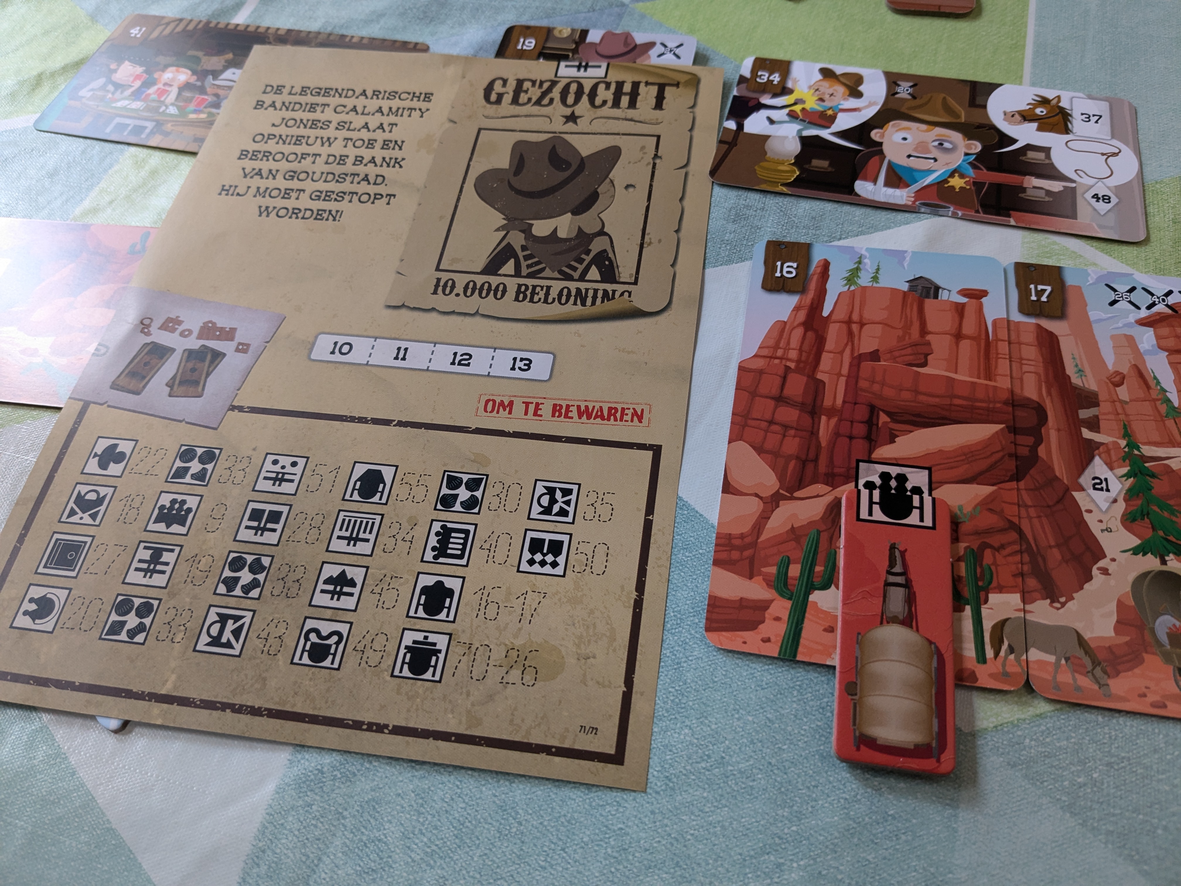 In de kinderversie werd dit handig opgelost door gebruik te maken van ‘tekens’ die je kan vormen door meerdere kaarten of speciale tegels te combineren. Het verkregen teken zoek je op een overzichtskaart en vertelt je welke kaart vervolgens genomen moet worden. Heel simpel, maar het werkt voor deze jonge leeftijd.