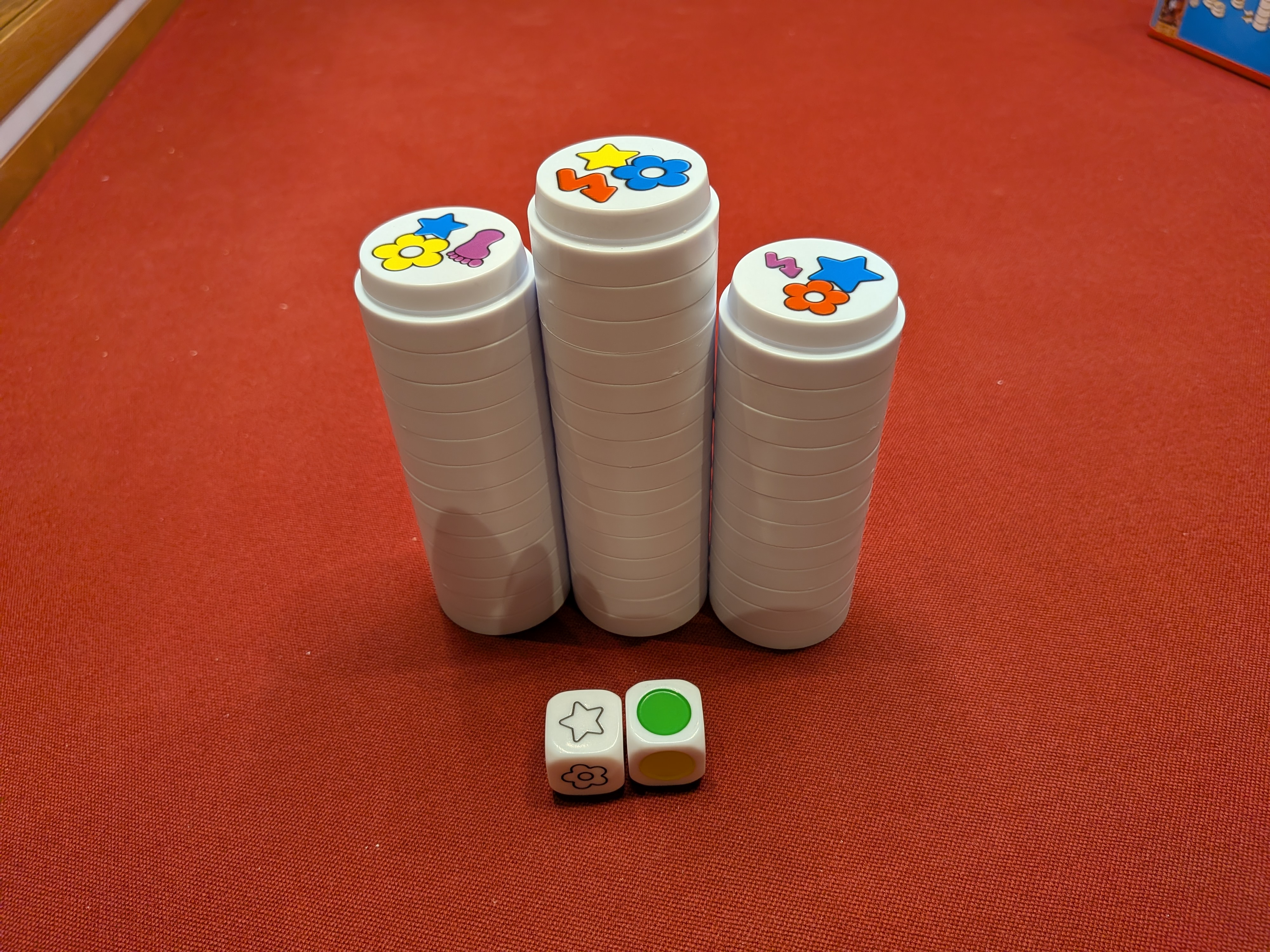 Eén speler gooit beide dobbelstenen. Deze worp bepaalt welke schijven genomen mogen worden. Bijvoorbeeld: alle schijven met een gele bloem. (zie afbeelding)