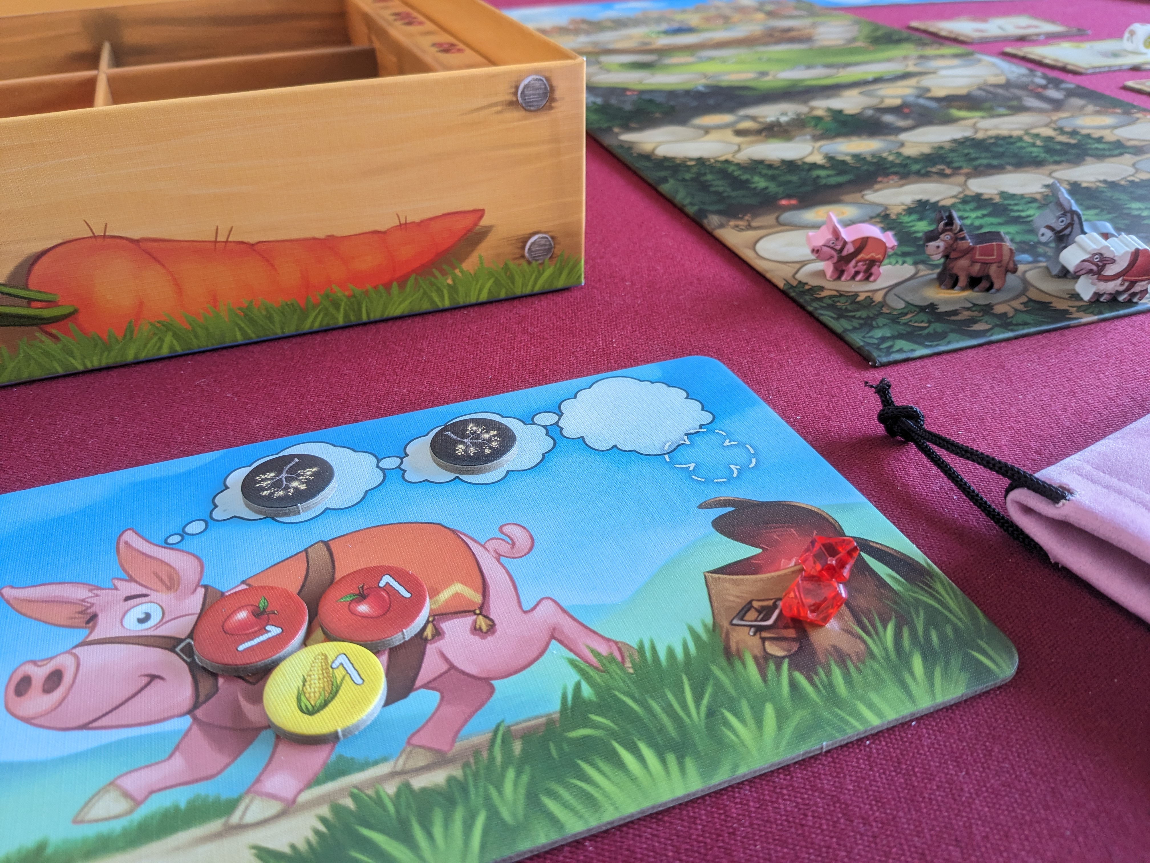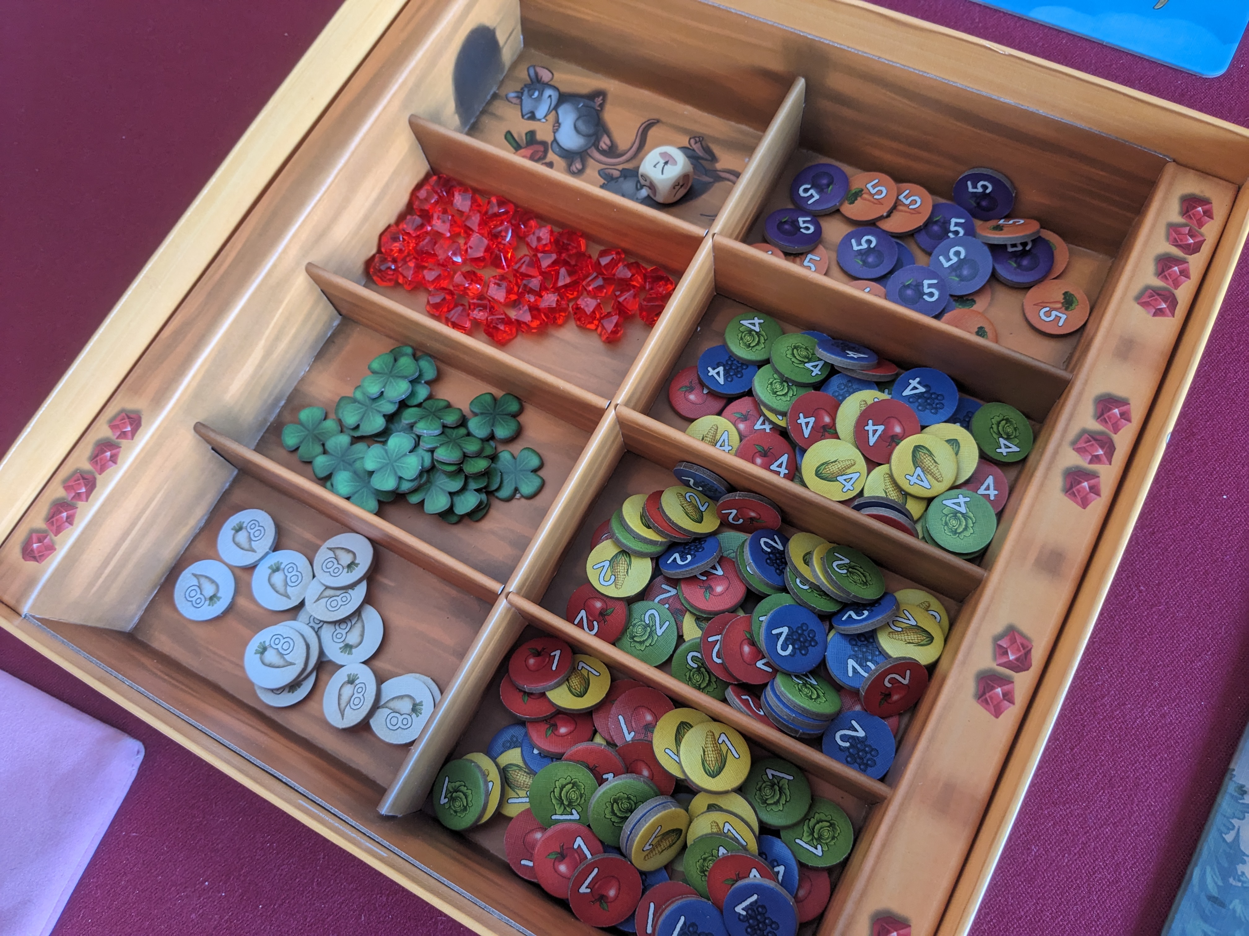 Over alles werd nagedacht. Zo heeft de doos bijvoorbeeld vakjes voor de verschillende voedselfiches, met op de zijkanten afgebeelde robijnen. Dit maakt alles zeer duidelijk voor het jonge volkje.