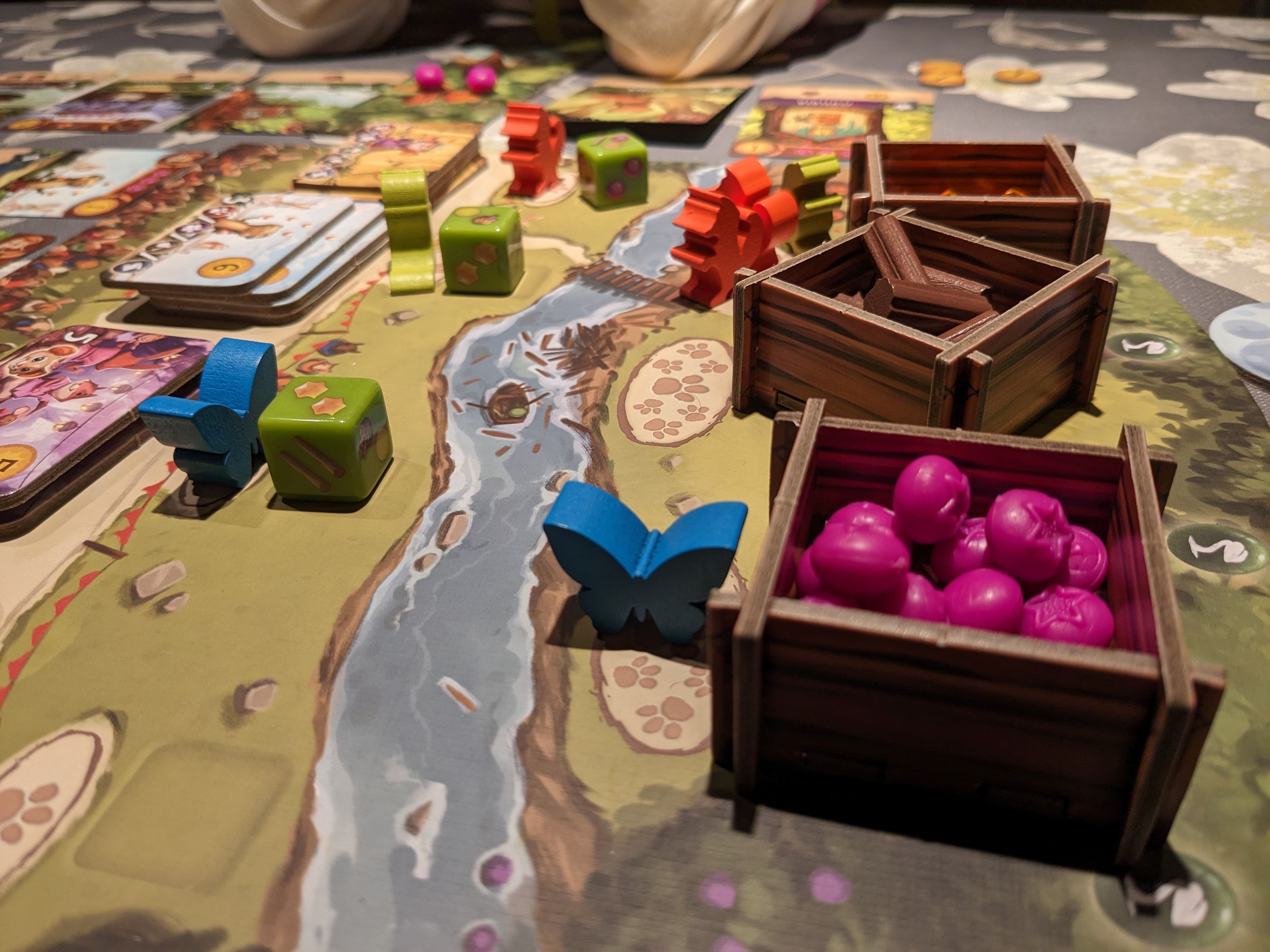 Ook het materiaal is hetzelfde als het oorspronkelijke spel, maar wel een beetje weinig. In de doos zitten extra kartonnen grondstoffen mochten er niet voldoende bessen, takken en hars zijn. Gezien de hoge aankoopprijs, mochten er gerust wat meer ‘echte’ grondstoffen in de doos zitten.