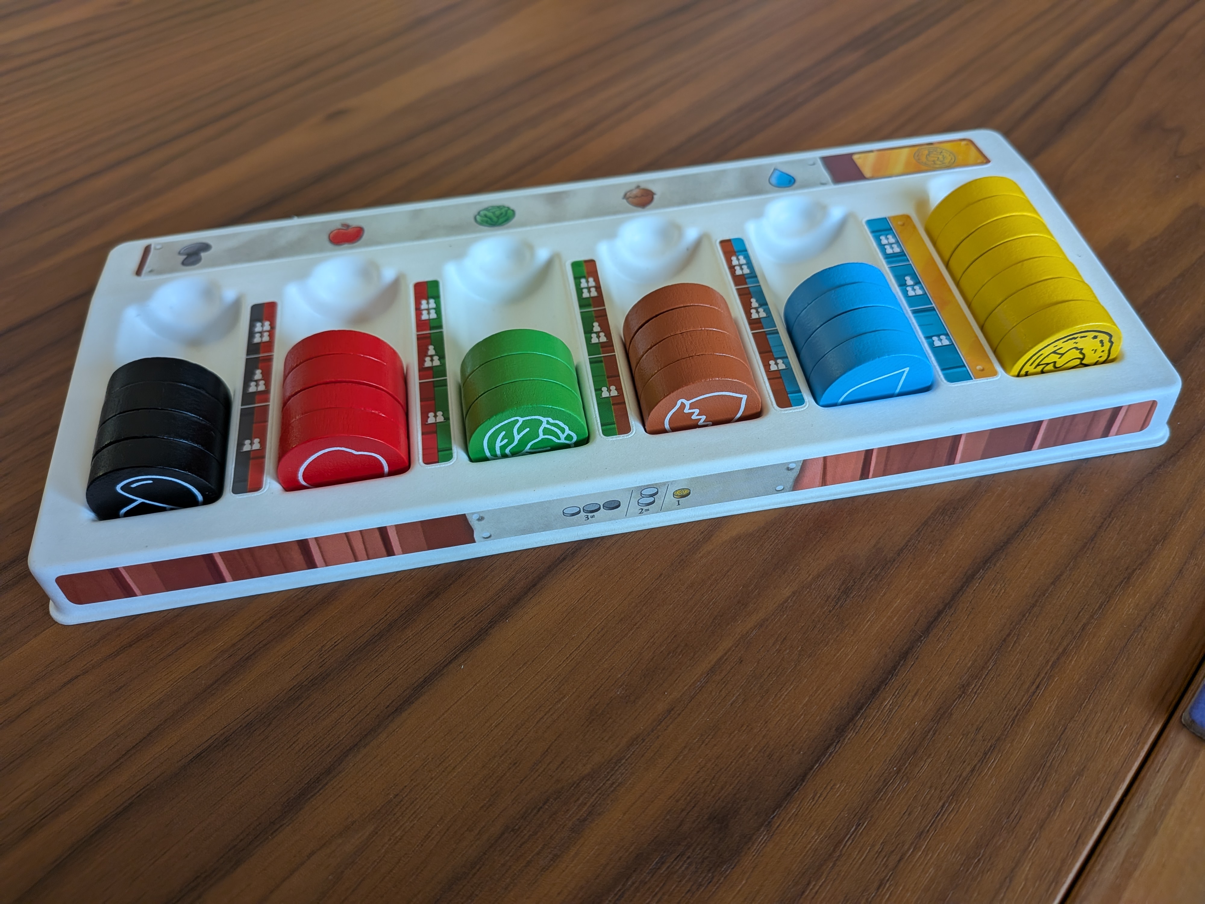 • Eveneens uitsparingen voor de verkregen grondstoftegels en een overzichtelijk grondstofbakje dat je kan doorgeven, zodat altijd duidelijk is wie de actieve speler is.