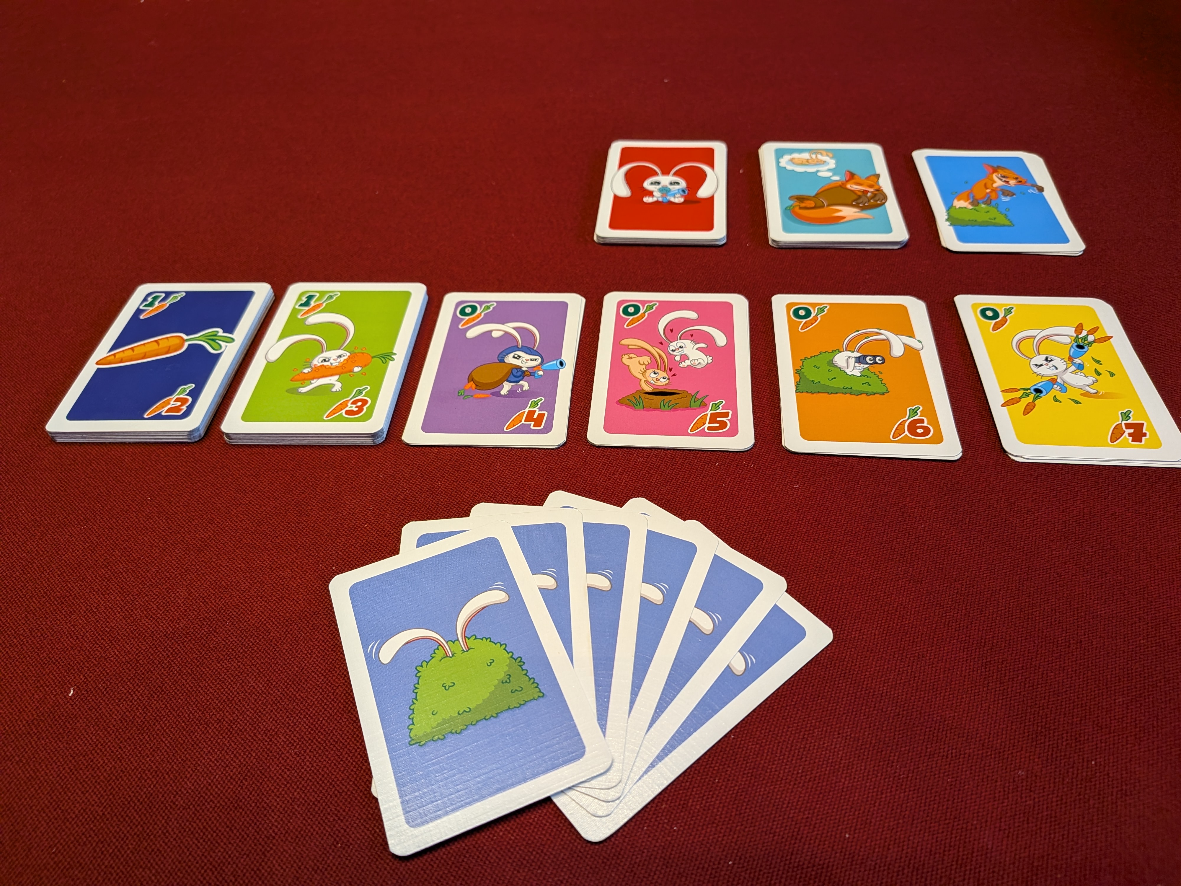 In Badass Bunnies start iedere speler met dezelfde set kaarten. Twee kaarten met een wortel op, twee kaarten met een konijn én een wortel op en ook twee kaarten met een vos erop.