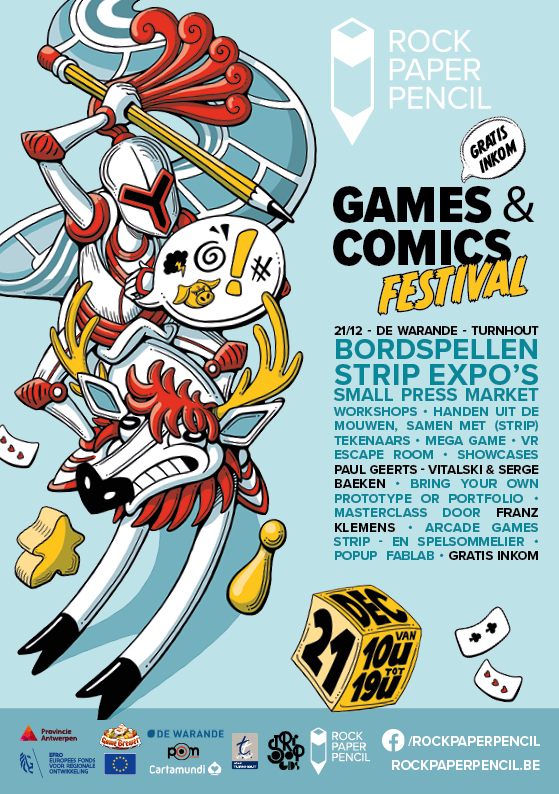 Deze beurs, die zich zowel naar de stripliefhebbers als naar de bordspelers richt, vindt plaats in de Warande te Turnhout, van 10u tot 19u. Turnhout is de thuisstad van zowel speelkaartenproducent Carta Mundi als van spellenuitgever Game Brewer. Beiden ondersteunen Rock Paper Pencil Games & Comics Festival.