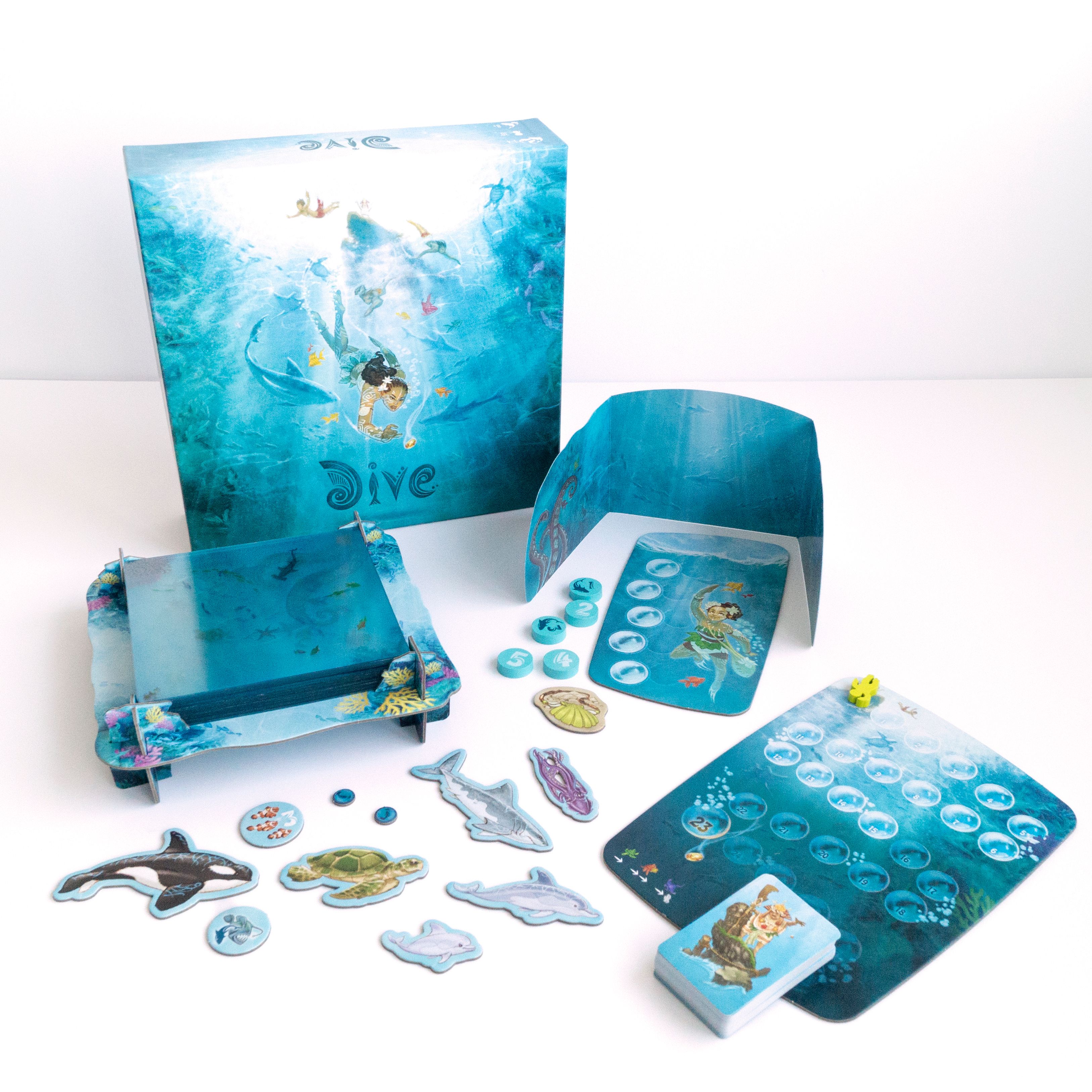 Centraal in Dive staat de zee: een stapel bedrukte, transparante zeekaarten in een kartonnen frame. De spelers zijn de duikers op zoek naar de heilige steen. Ze zullen van bovenaf de kaarten bekijken, hun duik voorbereiden en vervolgens zullen ze gelijktijdig in zee duiken.