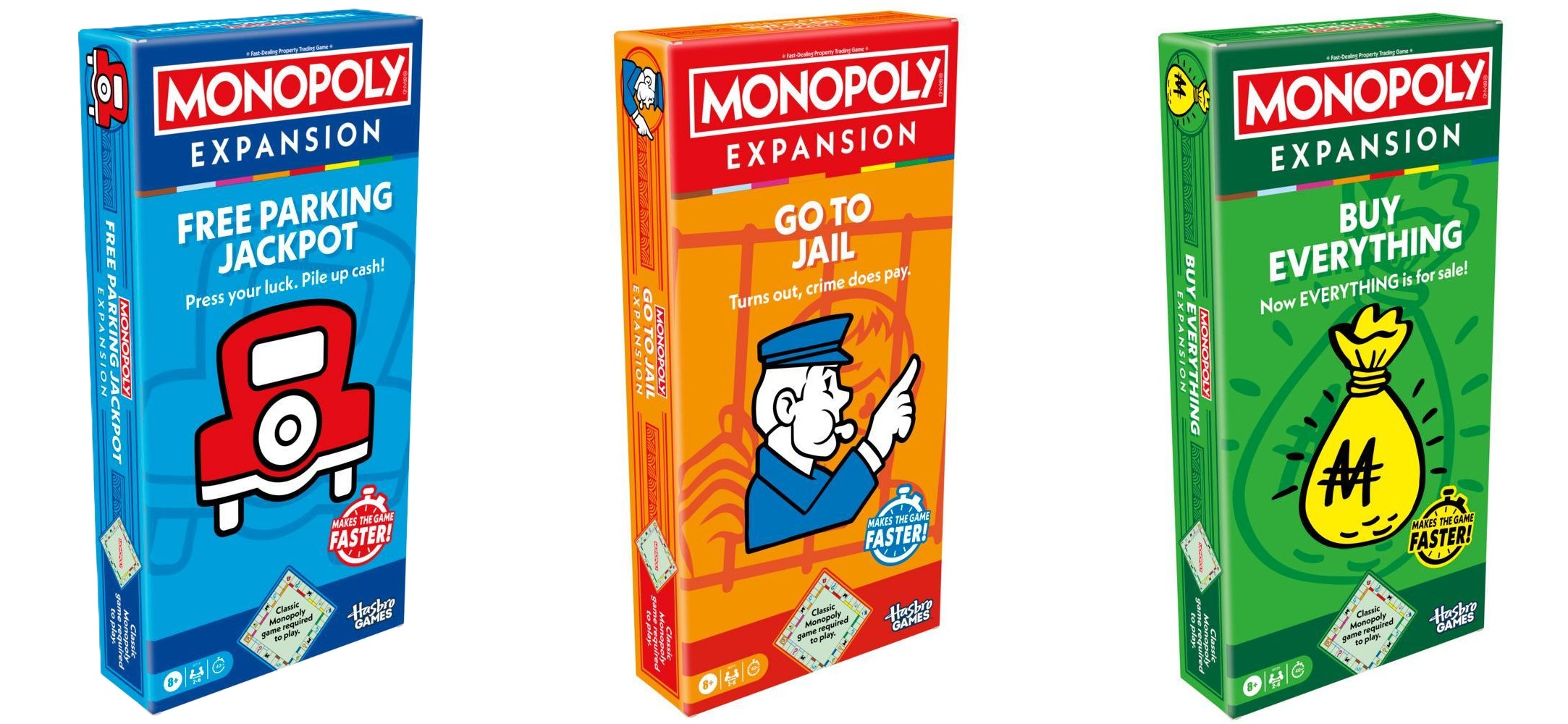 De drie nieuwe uitbreidingssets – Go to Jail, Buy Everything en Free Parking Jackpot – voegen nieuwe spelmogelijkheden en snellere rondes toe. Spelers krijgen onder meer de kans om extra geld te winnen, nieuwe kaarten te verzamelen voor strategische zetten en zelfs elk vakje op het bord, inclusief de bank, te kopen. Deze veranderingen zijn geïnspireerd door feedback van fans, aldus Hasbro.