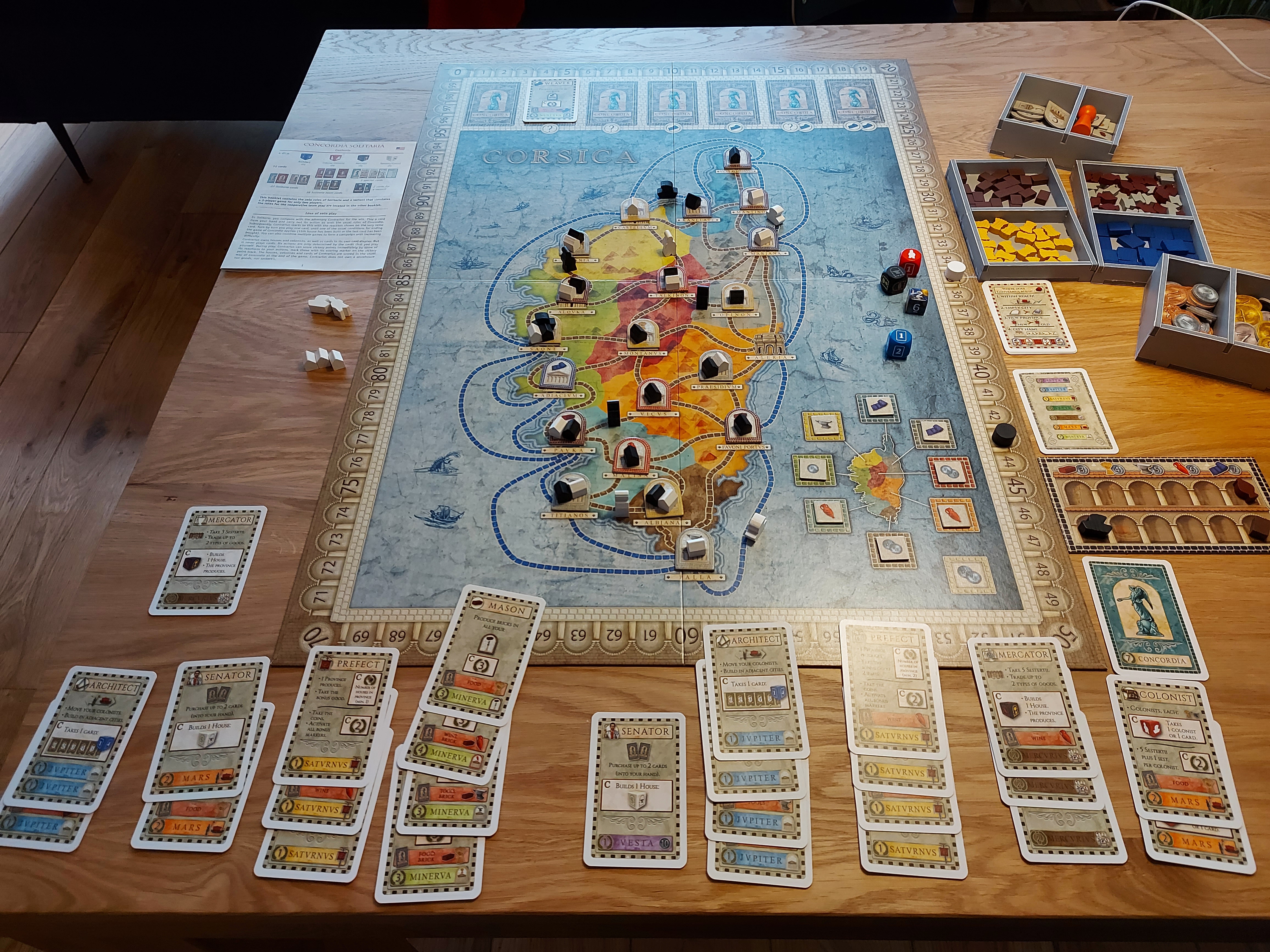 Als ik nou één spelletje zou mogen noemen waar ik met veel plezier naar uitkeek, dan was dat Concordia Solitaria. Een van onze elegantste spellen in huis, dat ik heel graag speel, maar waar mijn huisgenoten anders over denken. Na veel zelf te hebben geprobeerd, met wisselend succes (zie ander draadje https://www.bordspelmania.eu/solo-f117/topic27517.html, kwam dan eindelijk een officiële solo variant op de markt.