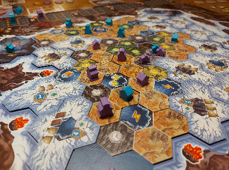 De thematische setting is leuk en levert een mooi modulair speelbord op. Meer dan een setting is het niet, het thema komt nergens echt sterk naar boven. Waarmee ik niet wil zeggen dat het een droog spel is, geenszins zelfs. Het omdraaien van de besneeuwde tegels en het om de beurt plaatsen van poppetjes en huisjes, waardoor het speelbord steeds kleuriger wordt richting de hoeken waar veel punten te verdienen zijn, heeft iets prettigs.
