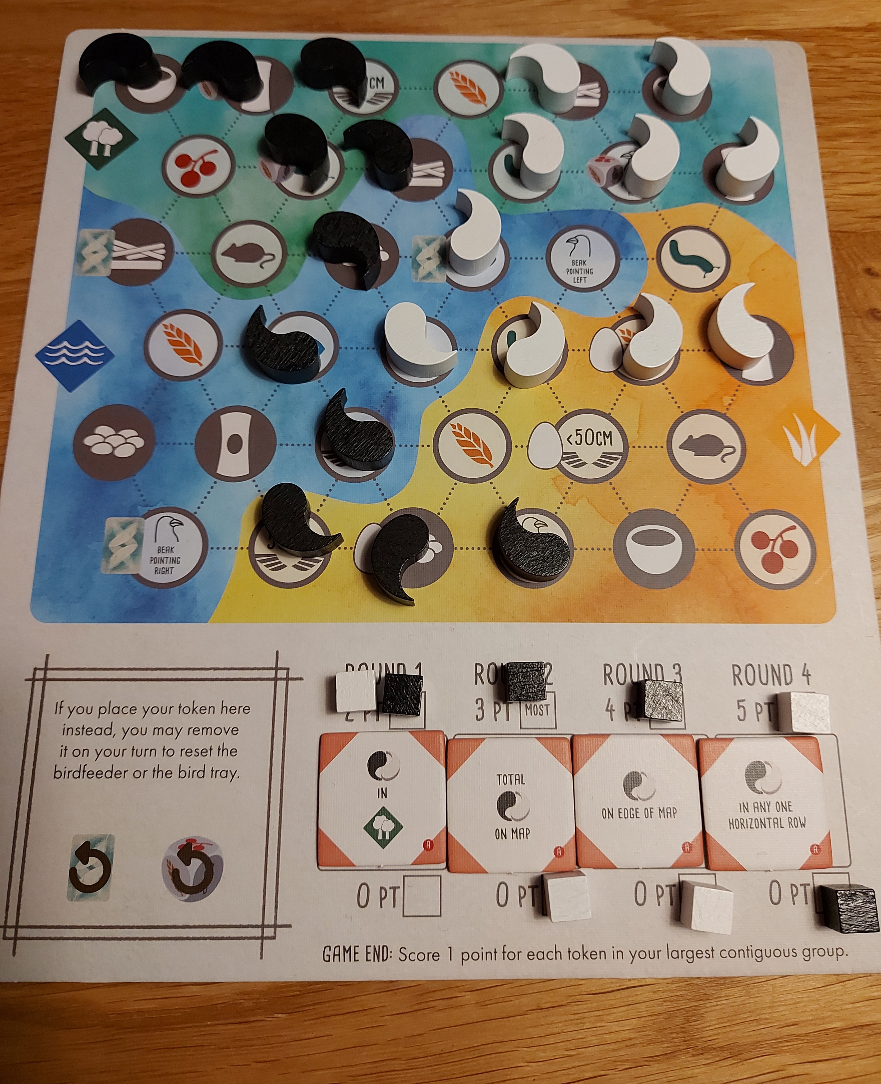 Ook speel je met een nieuw centraal bordje: een weergave van het bos, grasland en water en daarop allemaal onderling verbonden plekjes waar je je eigen Yin of Yang blokjes op kunt plaatsen zodra je een vogel speelt. Op sommige van die plekjes krijg je een bonus maar de meeste zijn bedoeld om een zo groot mogelijk aaneengesloten gebied te krijgen voor een zo hoog mogelijke eindtelling. Een extra scoremogelijkheid dus. Dat Yin en Yang is ook nog verbonden met nieuwe rondedoelen, waarmee in de duetvariant dus de ‘gewone’ rondedoelen vervallen. Ook nieuw: bonuskaarten die bijvoorbeeld scoren op op- of aflopende basisscore van je vogels.