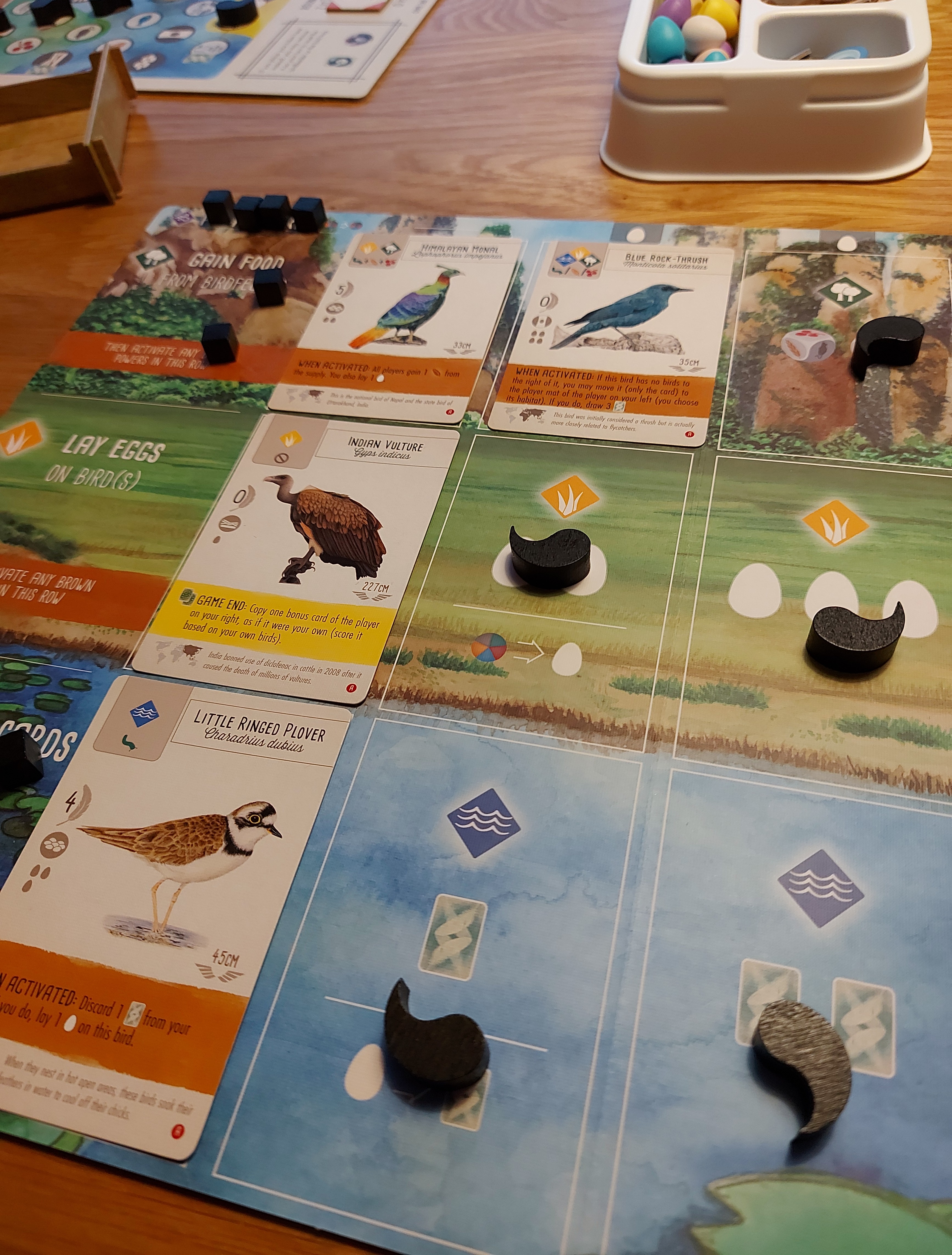 Zoals gezegd speelden we voorlopig vooral de duet variant met alleen de Azië kaarten. Je speelt Azië Duet op de ‘oude bordjes’ maar met een mooi nieuw Aziatisch landschap. Zonder nectar dus, met makkelijker eieren leggen dan voedsel of kaarten pakken. We speelden dus ook ‘maar’ met 90 nieuwe kaarten en niet met de honderden die we gewend waren. Al snel bleek dat dit spel uitgebreid getest is op Duet. Het werkt als een tierelier en je zit pardoes een nieuw soort Wingspan te spelen. Voedsel is minder schaars dan in de basis, er zijn meerdere manieren om aan kaarten te komen en de neiging om vooral een grasland machine te bouwen wordt subtiel onderdrukt. En er is evenwicht tussen al die kaarten, zo lijkt het.