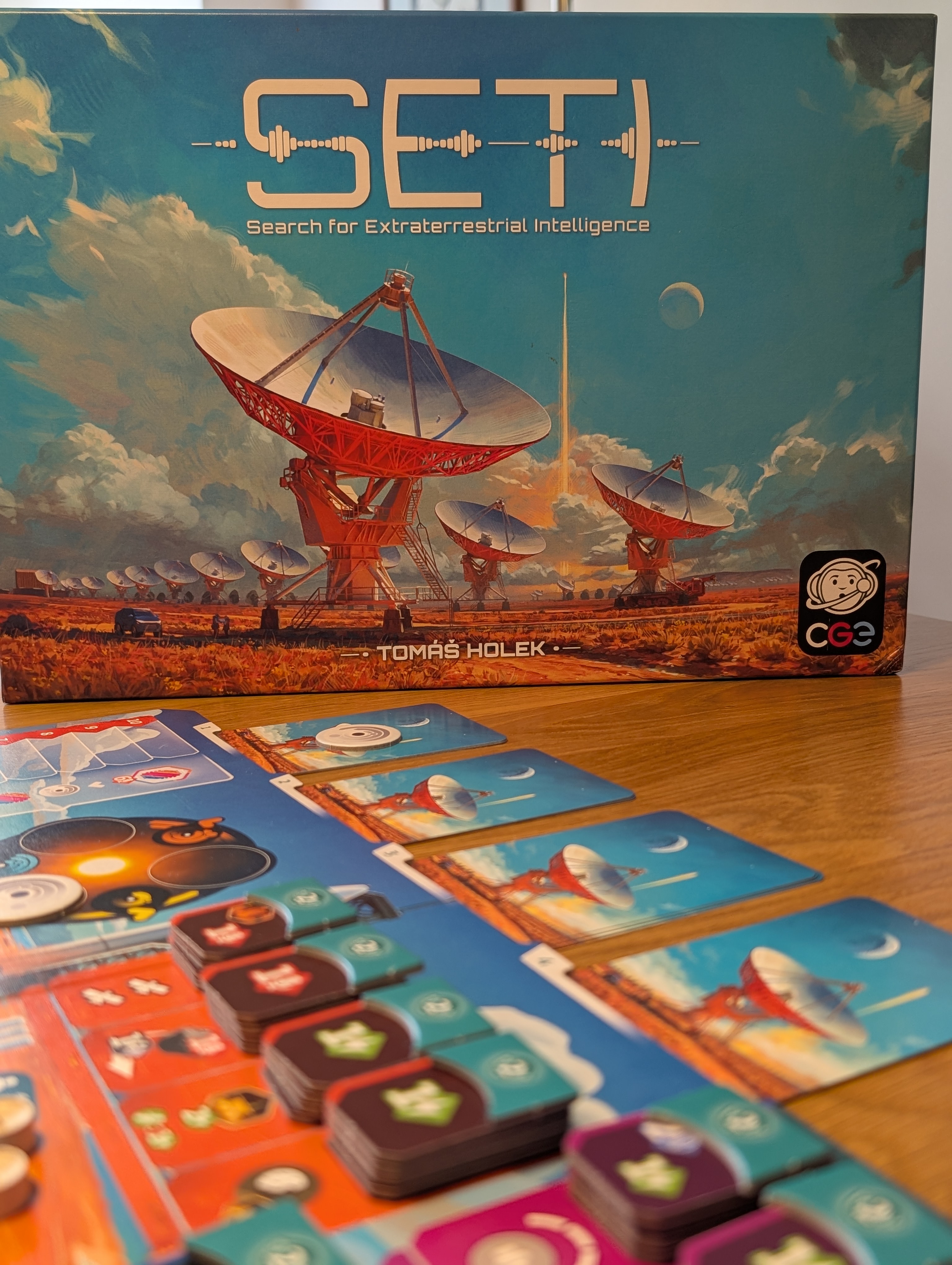SETI is een spel van Tomáš Holek, een jonge ontwerper waarvan binnenkort ook Theetuin in het Nederlands verschijnt (bij 999). In SETI ga je op twee manieren op ontdekkingstocht. Je gaat op een virtuele reis door ons eigen zonnestelsel met behulp van eigen sondes en landers (of zeg maar: plaatsen van werkers) én je scant het heelal op zoek naar ander leven waarbij je probeert de meeste data te verkrijgen (of zeg maar: een meerderheid te gelde te maken). SETI is daarbij een puntenpuzzel bij uitstek, gevoed door een berg aan unieke kaarten die meerdere functies kunnen hebben.