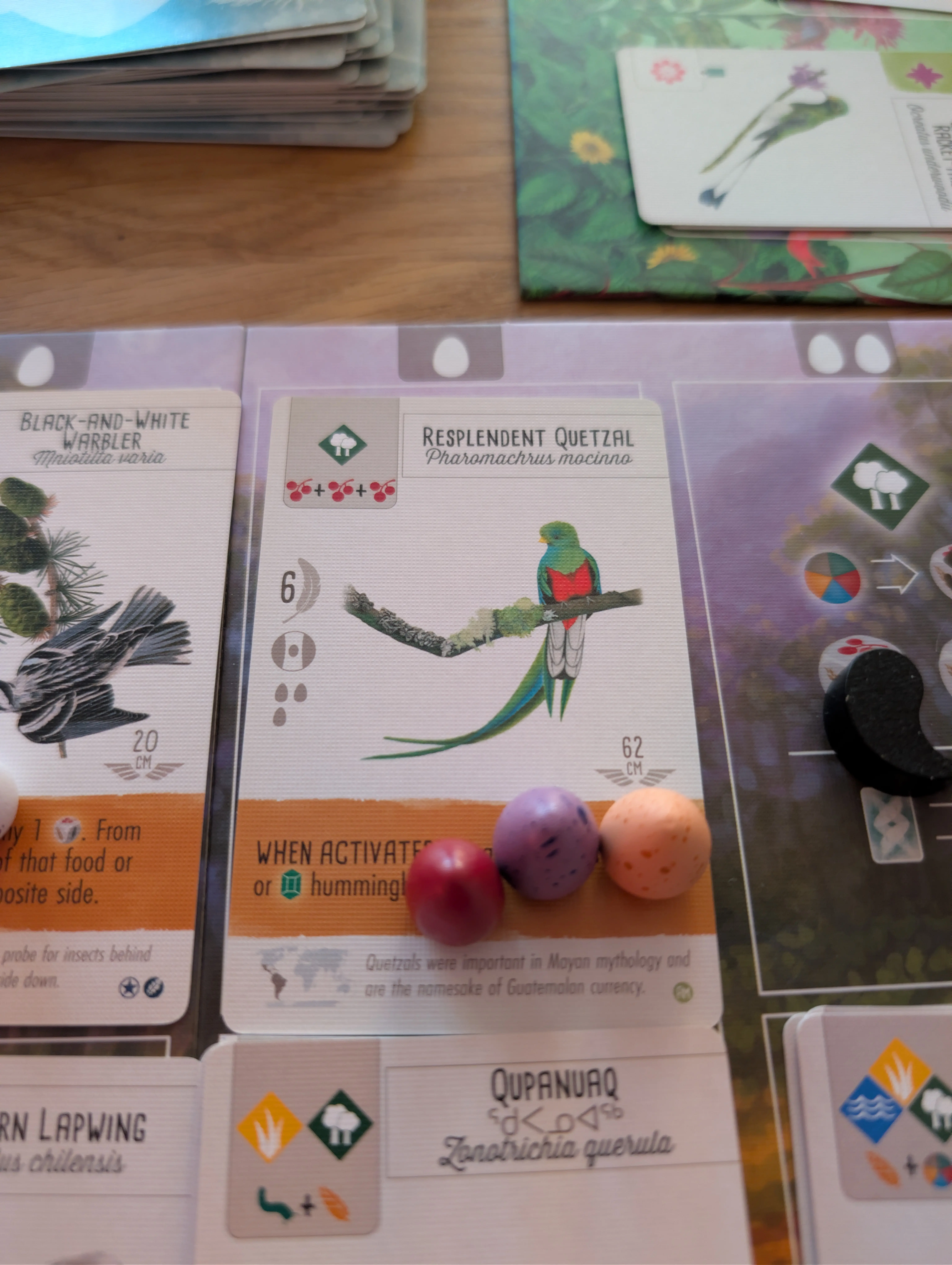 Die ongedurige beweging is precies wat je terugziet tijdens een spelletje Wingspan met de Amerika's. Ook de kolibriekaarten liggen nooit stil, bewegen van bord naar bord, doen daar even iets voor je spel en zijn alweer verdwenen. Goed bedacht, ik kan niet anders zeggen.