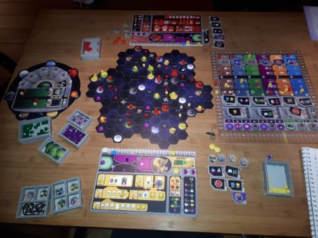 Eerste keer: Geoden tegen Taklons. Ondanks dat extra krachtblokje van de Taklons, waar mijn medespeelster goed gebruik van maakte, liepen de Geoden al heel snel uit. De tussendoelen pasten mij beter, de einddoelen eigenlijk ook. En de Geoden liepen heel snel door op de eerste twee technieksporen: terraformen en reizen. Met als gevolg: veel oranje gebouwen en ook nog op veel verschillende planeten. Lekker voor mij, maar uiteindelijk niet zo heel spannend. Ik bleef maar gaan en zij nam nog maar een biertje. Eindscore: 143 - 90. Dat kan dit spel zo hebben, als de ene machine gaat draaien en de ander maar blijft sleuren, peuren en duwen voor de punten.