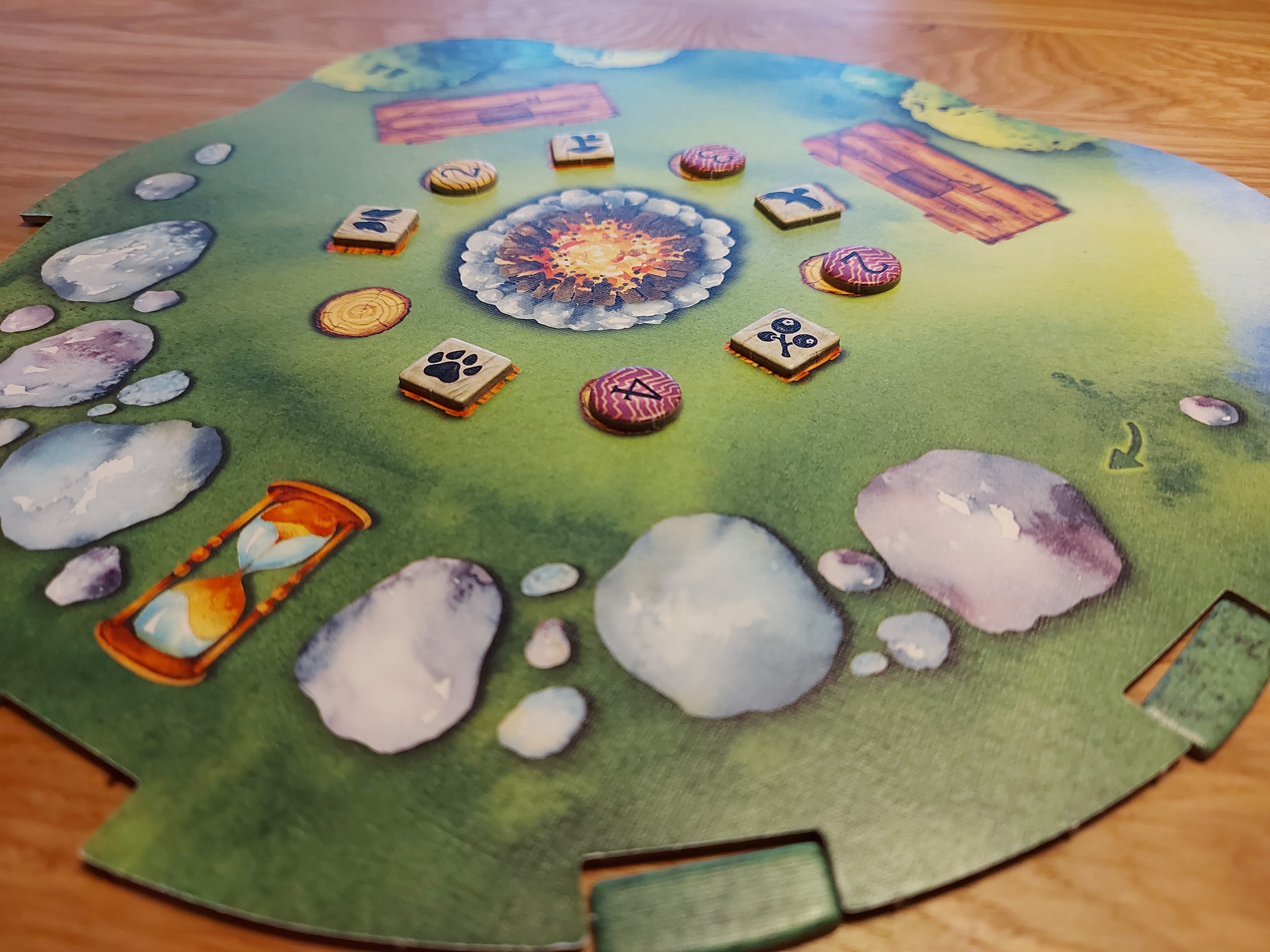 Behalve de kaartenweide ligt er nog een bord, eentje met extra opdrachten die extra punten opleveren: het kampvuurbord. Als je twee bepaalde symbolen voor je hebt liggen (elk spel zijn dat weer andere), kun je een puntenfiche op dat bord plaatsen. Daar zit misschien enige onbalans in: als je namelijk een van de opdrachten hebt vervuld, dan ben je automatisch al halverwege de volgende opdracht. Het komt regelmatig voor dat degene die de eerste bonus pakt, vrij snel daarna ook het tweede en soms zelfs derde fiche kan neerleggen. Dat zijn toch 9 punten in totaal, en in een spel waar de puntenverdeling verder zeer in balans is en je dus geen grote klappen kunt maken, pakt dat soms vervelend uit: je kunt de ‘koning bonuspakker’ niet meer inhalen.