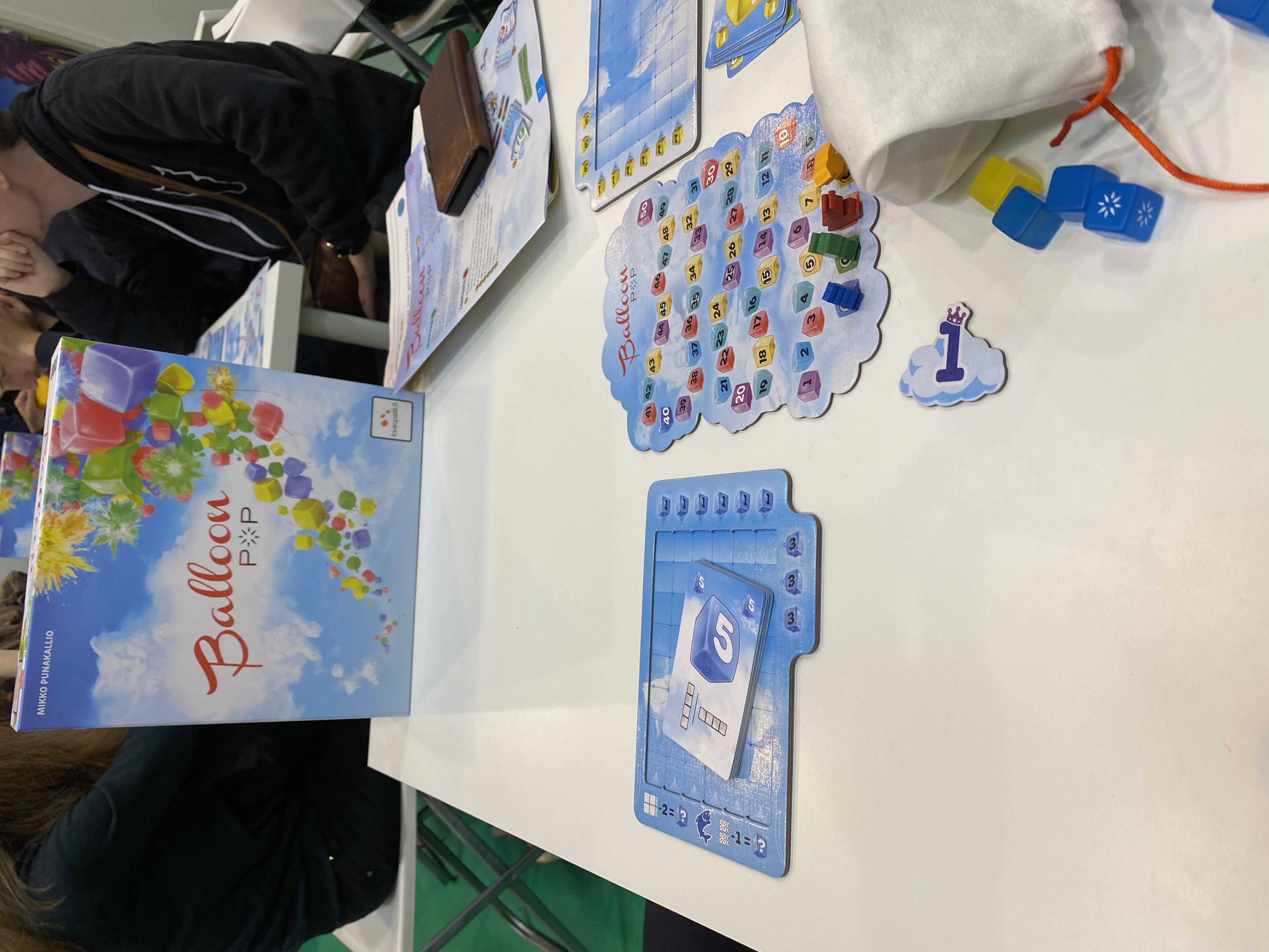 We liepen langs de Finse uitgever Lautapelit.fi. Daar speelden we het kleurrijke Balloon Pop. Een eenvoudig spel, waarbij je in acht ronden met handkaarten biedt op rijen van vier ballonnen (vierkante gekleurde stenen). Deze plaats je vervolgens onderop op je individuele bordje en stijgen dan naar boven. Je scoort punten door groepen van dezelfde kleur ballonnen te laten ontstaan, of ballonnen met symbolen die elkaar raken. Deze ballonnen spatten vervolgens uiteen en daarmee verdwijnen ze, al punten opleverend, van je bord. Na acht ronden scoor je ook nog punten voor lege kolommen en rijen op je eigen bordje. Vrolijk spelletje, maar geen collectiemateriaal voor ons.
