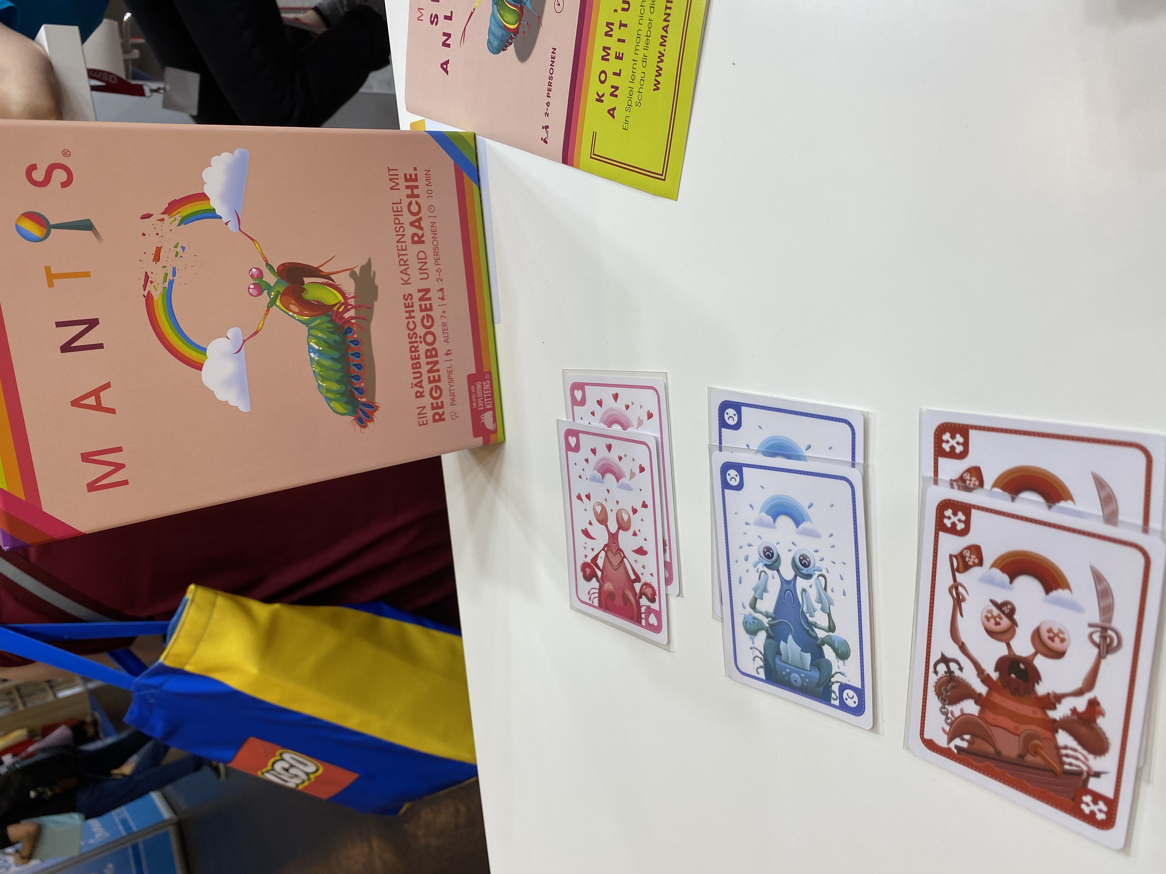 We speelden ook nog de Duitse uitgave van het kaartspelletje Mantis dat ook weer fraai uitzag. Het spel bevat zeven verschillende kleuren kaarten en op de achterzijde zijn drie mogelijke kleuren afgebeeld die de kaart aan de voorzijde kan hebben. In je beurt heb je keuze uit twee acties. Of je kiest voor stelen. Dan geef je aan bij welke van de tegenspelers je dat wenst te doen. Vervolgens draai je de bovenste kaart van de trekstapel om. Heeft die een kleur die bij de andere speler voorkomt in het tableau met zijn of haar kaarten, dan mag je al die kaarten toevoegen aan jouw tableau. Ligt die kleur kaart er nog niet, dan ontvang die andere speler jouw gedraaide kaart.