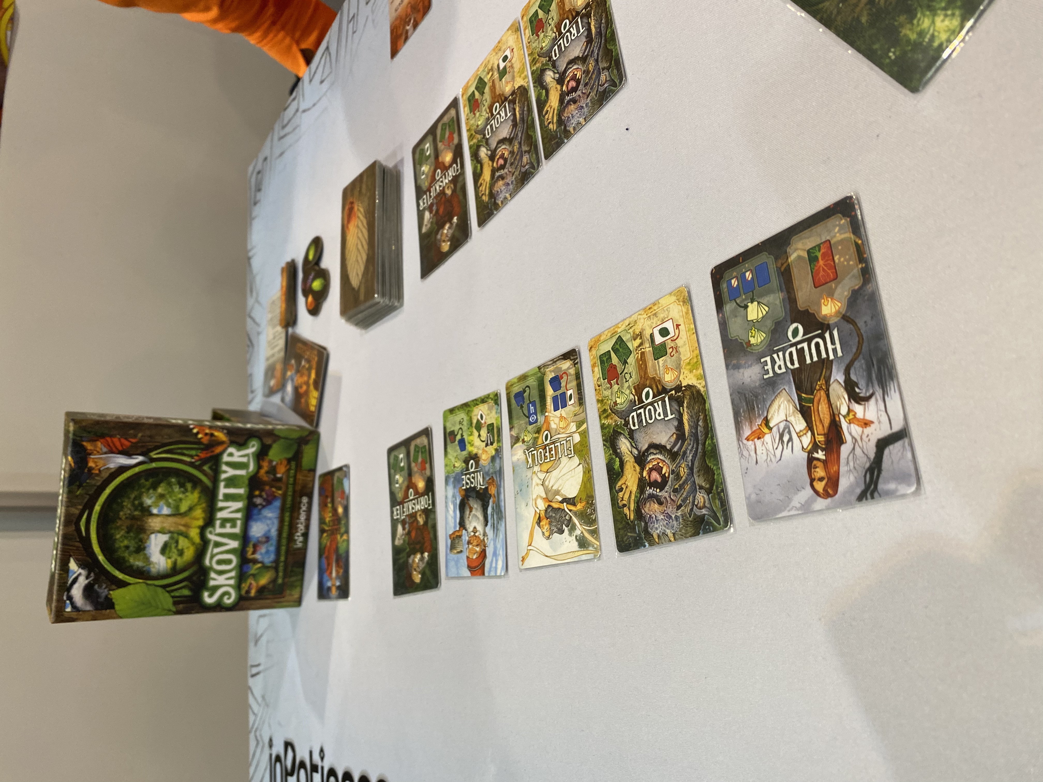 Vervolgens schoven we aan bij Skoventyr van uitgever Inpatience. Een kaarspel met als thema Noorse mythes, waarbij je monsters moet verslaan en de duivel voor moet zien te blijven op een rondel van bomen. We vonden de uitleg niet echt logisch en - wellicht mede daardoor - kon het ons niet bekoren. Wel fraai artwork van Vincent Dutrait, dat mij altijd weer opvalt.