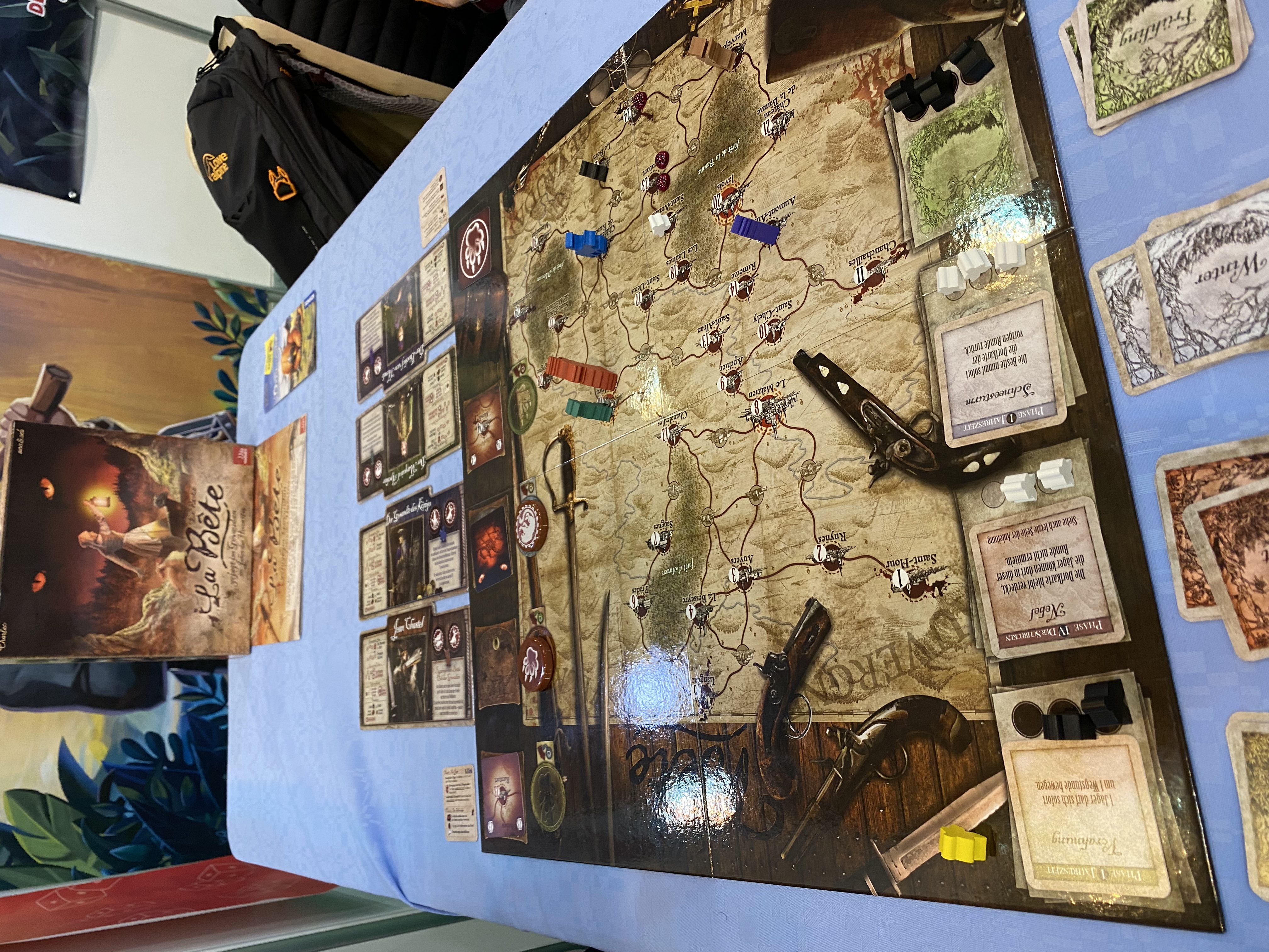 Daarna speelden we het prachtig uitgevoerde La Bête van uitgever Multivers dat zich afspeelt in de Franse provincie Gévaudan rond 1764. Een groep jagers moet het beest moet zien te identificeren/vangen, dat al moordend rondtrekt. Het bleek een tof asymmetrisch spel te zijn in de trand van Sherlock Holmes Consulting Detective. Helaas alleen in het Duits beschikbaar en vanwege de Duitstalige teksten in het spel niet aangeschaft.