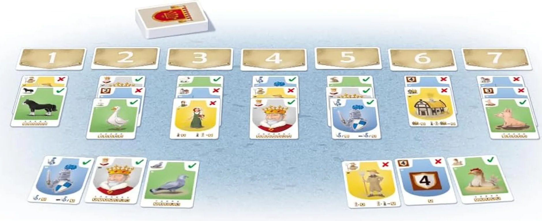 Een aantal sets, afhankelijk van het spelersaantal, ligt open in het midden van de tafel. Elke set bestaat uit 3 kaarten en een nummer. Dat nummer is belangrijk omdat de spelers gelijktijdig een set kiezen door een aantal vingers te tonen. Dit doen ze op het ritme van: “blad, steen, schaar” wat voor de gelegenheid vervangen wordt door: “Kip, koe, koning”.