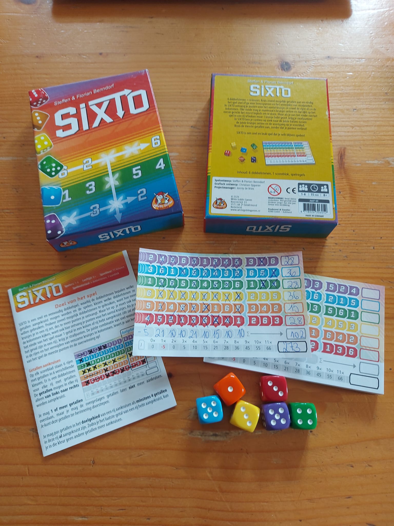 Sixto ziet er aantrekkelijk uit: leuke cover, zes kleurige dobbelstenen (paars, blauw, groen, geel, oranje en rood) en zes verschillende scoreblaadjes die dubbelzijdig bedrukt zijn, zodat je uiteindelijk twaalf verschillende scoreformulieren krijgt.
