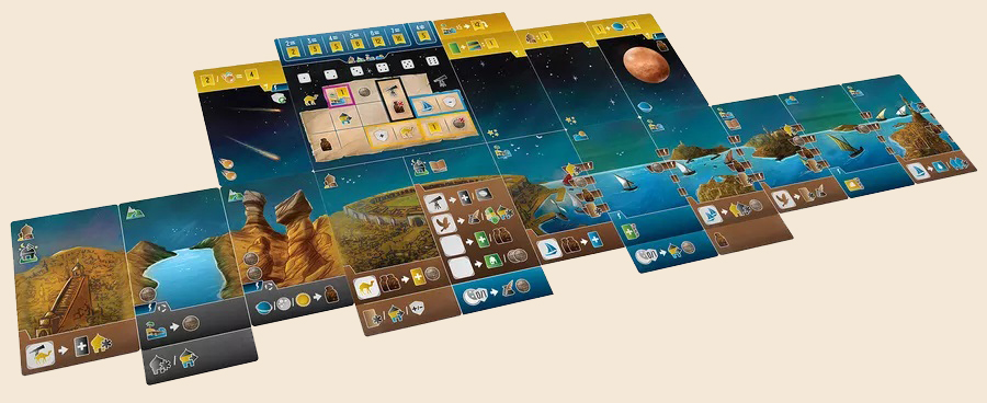 In uw beurt mag u één dobbelsteen of arbeider plaatsen of rusten. De actiemogelijkheden zijn bij de start voor elke speler gelijk maar aan de hand van land – en zeekaarten kunt u een eigen palet aan mogelijkheden creëren.