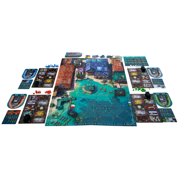We zijn er nog niet. Dit is het algemeen speelmateriaal. Daarnaast heeft ook nog iedere speler in zijn kleur (wit, blauw, groen of rood) zijn eigen speelmateriaal, zijnde 1 persoonlijk spelerstableau, 1 grote baasmeeple met hoed, 5 werkersmeeples, 1 envelopfiche om de autoriteiten om te kopen, 1 sluisfondskist, 1 rechthoekige scoresteen, 1 groot blokje om de beurtvolgorde in zone 10 aan te geven, 23 kleine blokjes om verschillende dingen te kunnen markeren, 1 zodiac, 1 zodiactegel, 1 overzichtskaart en 1 overzichtskaart met de duikregels.
